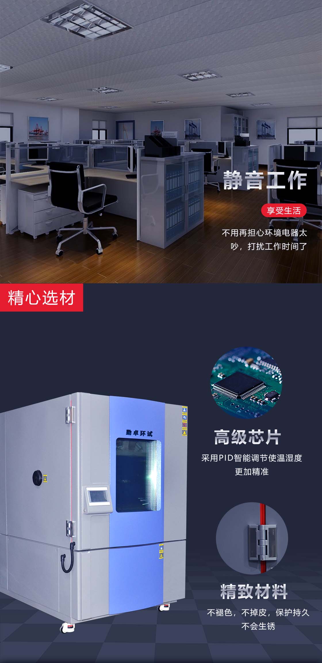 试验箱结构设计先进合理,配套产品和功能元器件具有国际先进水平,能够适 应长期、稳定、安全、可靠的生产需求。能够满足用户为从事上述用途的加工生产要 求,且使用、操作、维修方便,使用寿命长,造型美观,有良好的用户界面,使用户的操作和监测都更加简单和直观。