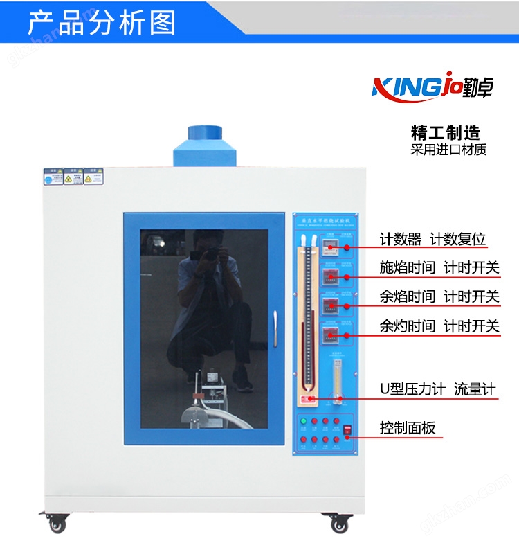一、垂直水平燃烧试验机概述:是适用于塑料等固体材料和按GB6343测定的表观密度不低于250kg/m2的泡沫材料在水平和垂直放置时用小火焰点火源点燃后的燃烧性能的测试的仪器。二、垂直水平燃烧试验机技术参数:1、 电子点火,点火距试样距离:150mm,蓝色火焰高度:20mm±2mm;2、 燃烧试验空间大于0.5立方米;3、 燃烧器自动定时定