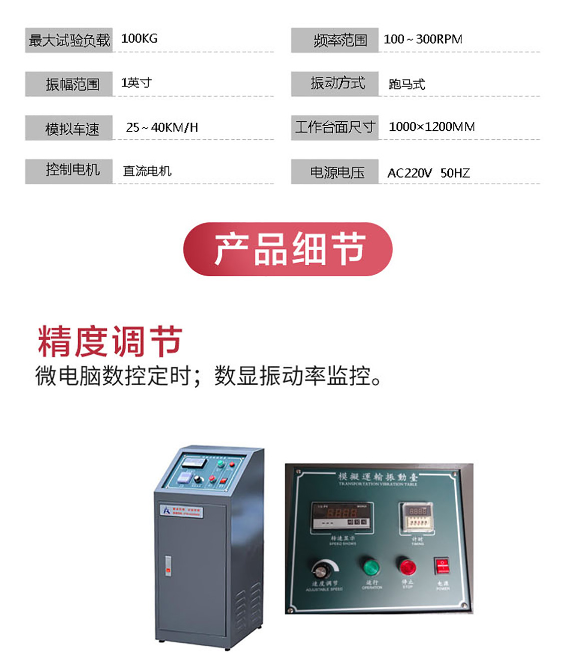 模拟运输振动试验台适用于玩具、电子、家具、礼品、陶瓷、通讯、器材、计算机及汽车零件的震动试验等,用来视察其耐运输效果或耐久性均匀。数字仪表显示振动频率;同步静噪皮带传动比;试品装夹采用导轨式,操作方便、安全;机台底座采用重型槽钢配减振胶垫,安装方便,运行平稳,无需安装地脚螺丝;直流电机调速,运行平稳,负载能力强。